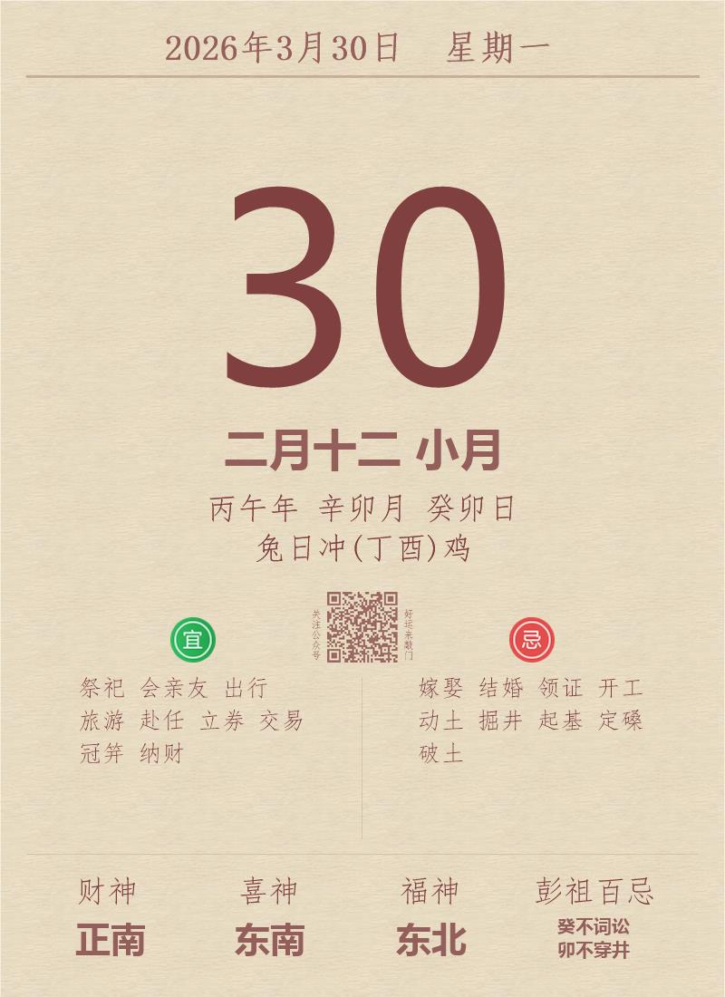 今日老黄历(2026年3月30日):黄历宜忌、财神方位、特吉生肖、打麻将财位