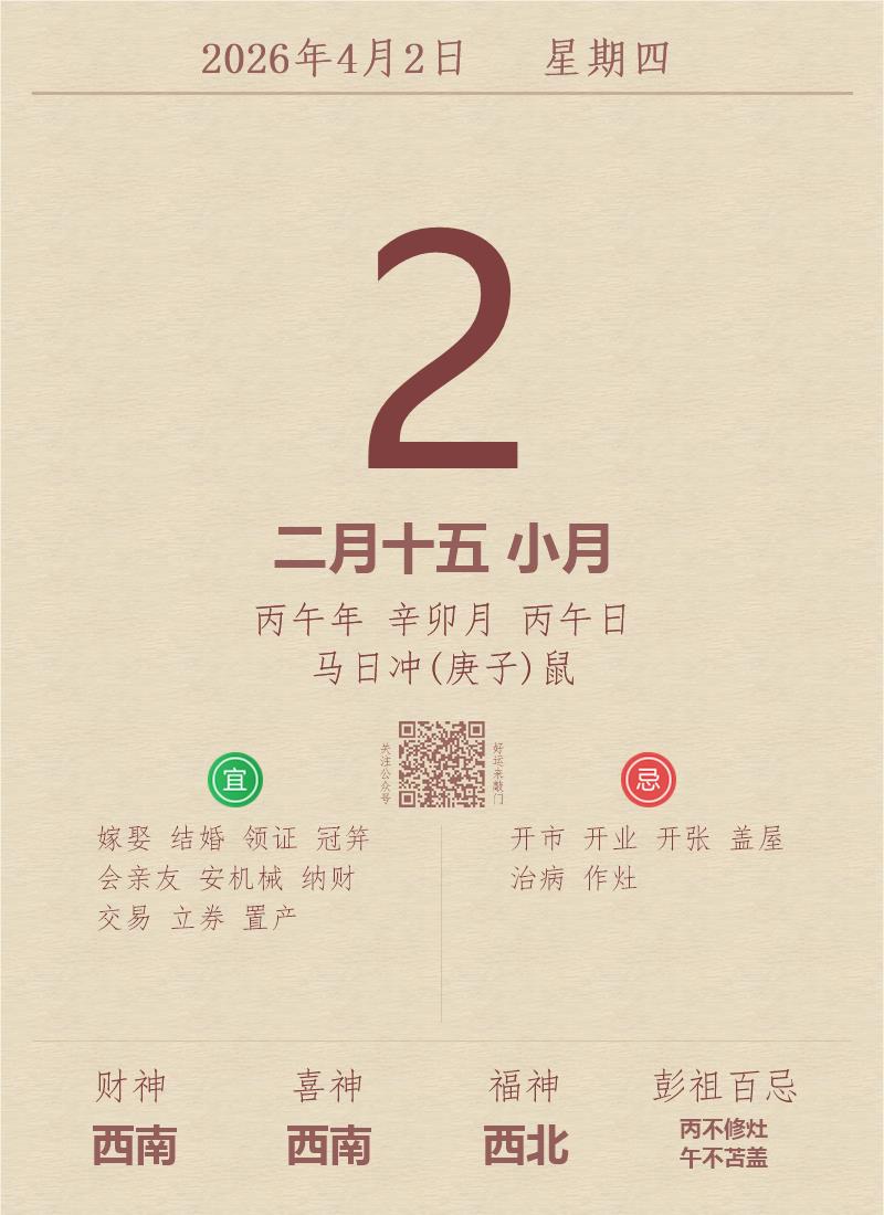 今日老黄历(2026年4月2日):黄历宜忌、财神方位、特吉生肖、打麻将财位