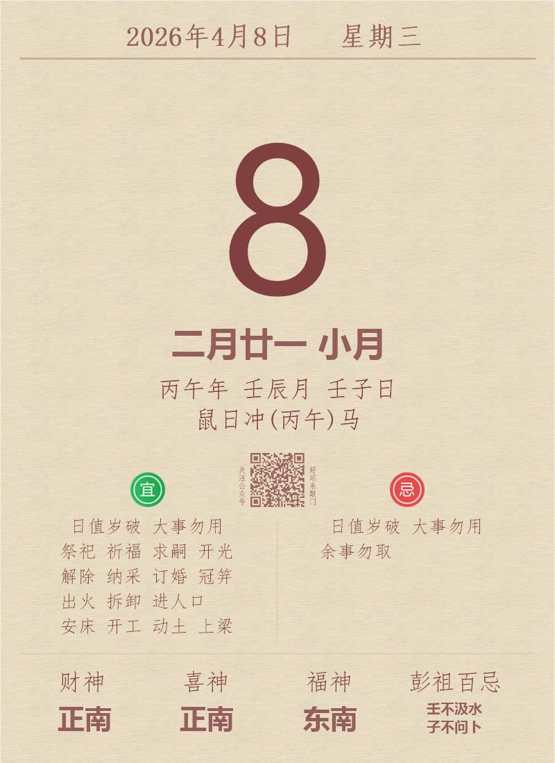 今日老黄历(2026年4月8日):黄历宜忌、财神方位、特吉生肖、打麻将财位