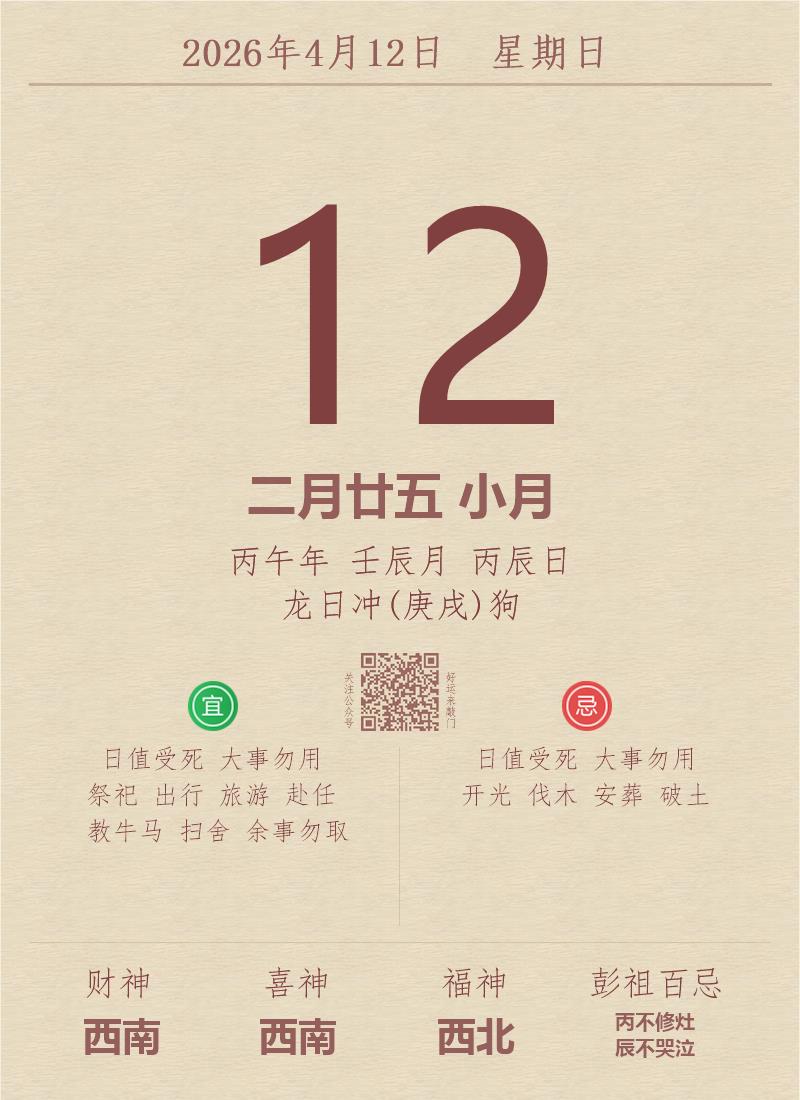 今日老黄历(2026年4月12日):黄历宜忌、财神方位、特吉生肖、打麻将财位