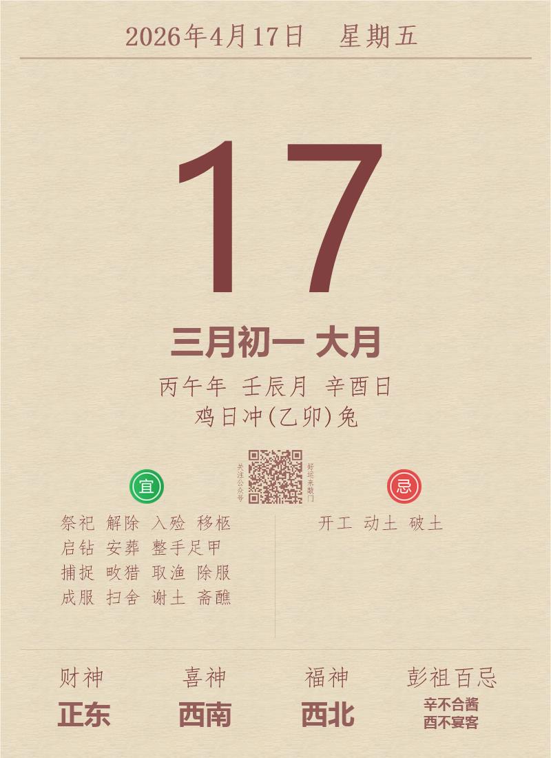 今日老黄历(2026年4月17日):黄历宜忌、财神方位、特吉生肖、打麻将财位