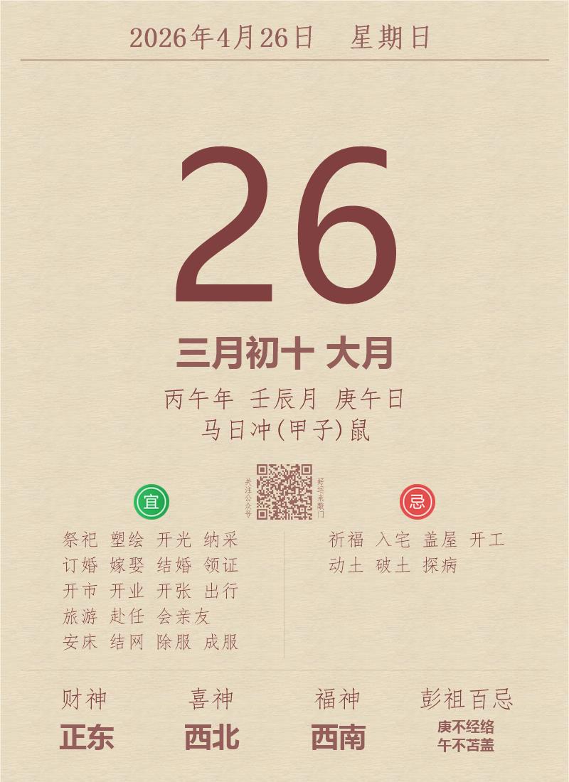 今日老黄历(2026年4月26日):黄历宜忌、财神方位、特吉生肖、打麻将财位