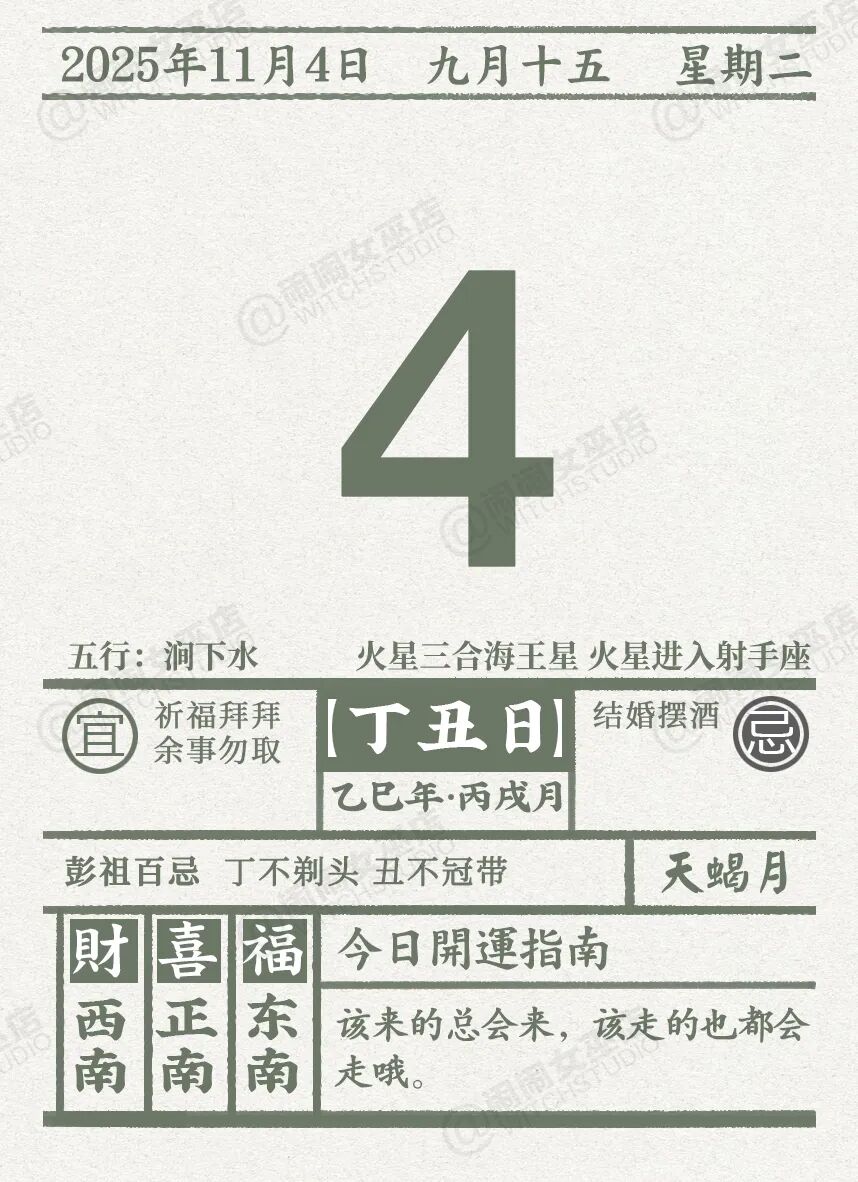 今天,你会迎来一种结束。可能是情感关系或合作关系的结束,也可能是一个项目的结束收尾,进入款项结算阶段。任何拖沓、怠慢都不适合出现在今天。如果你要面临人际关系的“结束”,建议你采用潇洒的姿态。