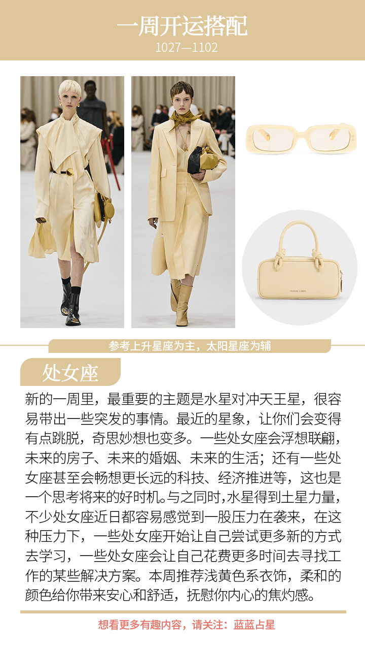 最后,本周是金星互容土星的最后一周,从10月中开始,金星和土星形成的结构,一方面让我们很多金钱、感情方面的事情,都容易有一个很踏实的进展,或者是得到某个结果;另一方面,一些人会在感情上做出新决定,而这种决定经常是同居、订婚、结婚的前奏。如果在金钱和感情上还想把握时机的话,本周记得抓牢!