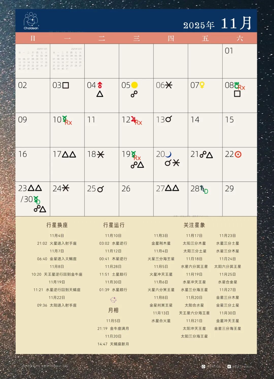 天秤们,未来两周仍需要追求金钱。个人财产、收入、机械学习,以及与露水情缘对象的亲密关系会成为这段时间的核心,都有好运加持。12月中旬前,你会始终心绪不宁,总想外出远行,还会被各类沟通事务和文书工作缠身。这类源自过往的状态或事务,如今或不久后便会重现。11月30日前,不要开启任何新恋情或新项目(包括大额采购)。昔日好友或旧爱或许会突然出现。你的事业发展与社会声望正得到12年来最有利的星象加持,这份助力将持续至2026年7月。周日至周一上午,会凸显这条好运轨迹,顺势而为就好。周一上午至周三下午4点(太平洋标准时间),愉悦的心情、乐观的心态、社交乐趣、调情的时刻以及人气都会降临在你身上。周一的情况会有些混乱,但这段时间(包括整体时段)最终都会圆满收尾。周三晚间至周五,回避、低调行事,休息并思考。周三当天及周四黎明前要小心,存在意外风险,还可能发生争执。周四上午过后,一切就会趋于平稳。这段时间可与政府部门或总部对接相关事务。周六将开启一个聚焦于你个人发展与宣传的周末,这段时间有望收获诸多成功。