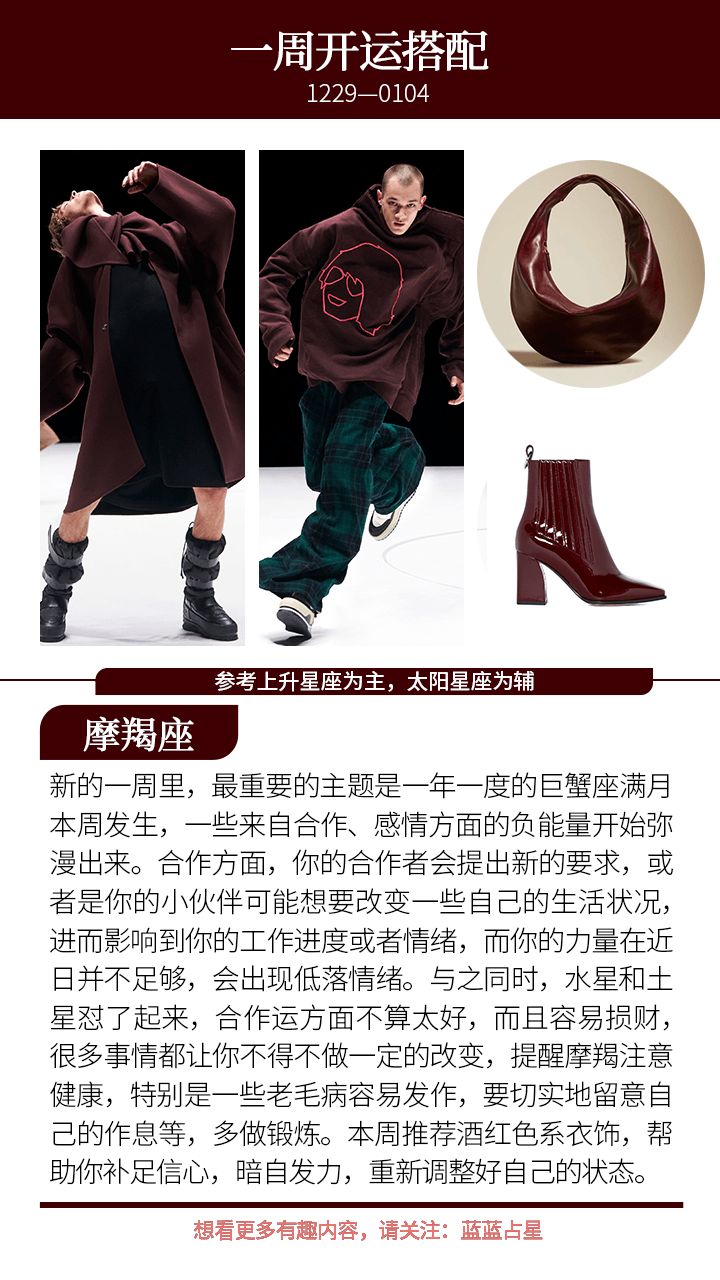 巨蟹、摩羯请注意健康和感情、合作关系,易遇见某合作结束、和竞争对手正式展出“战斗”、感情分离或踏入新阶段。白羊、天秤也请多关爱家人。